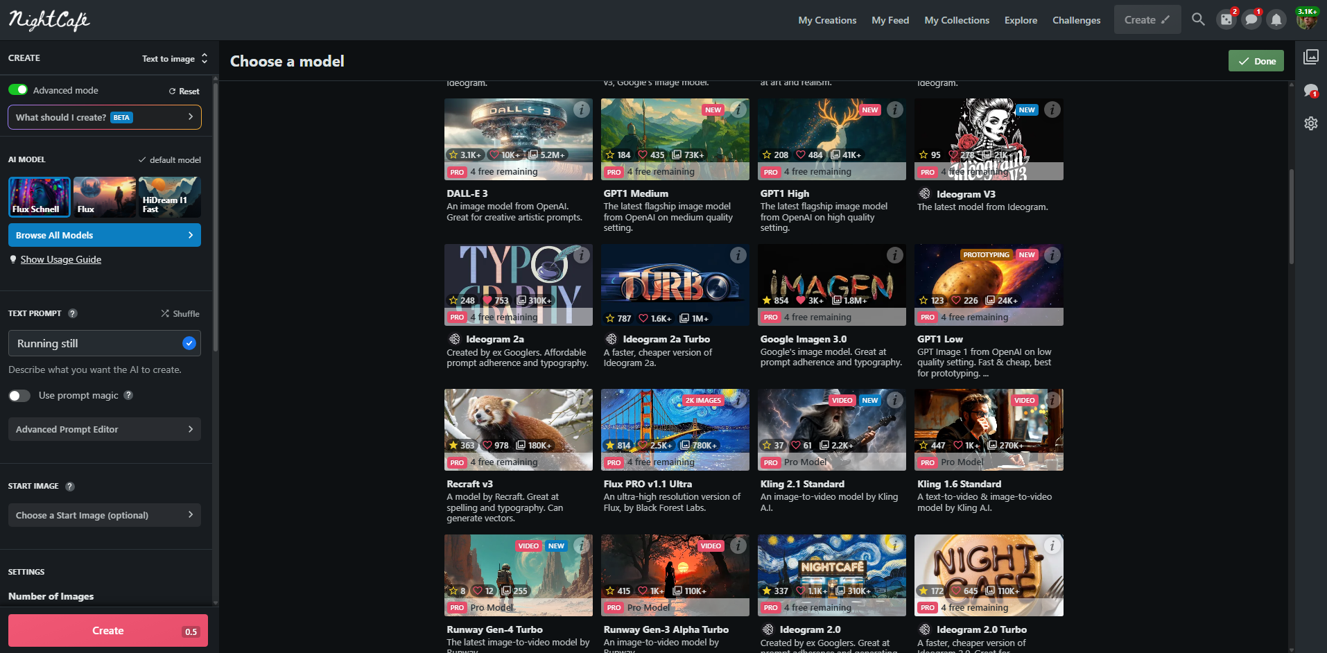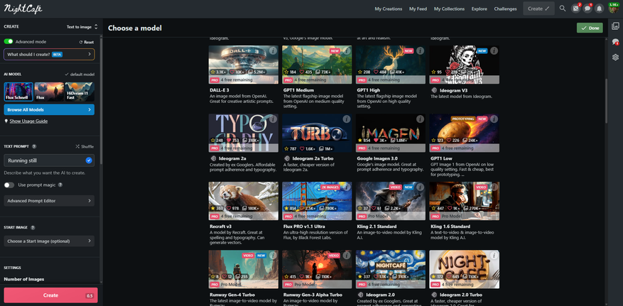 Платная подписка даёт доступ к Pro моделям вроде полноценной Imagen, Flux Pro, Flux pro 1.1 (а также Ultra и режиму Raw), DALL-E 3, GPT, Ideogram, Recraft, возможность создания коротких видео с помощью Runway или Luma Dream Machine на основе своих картинок