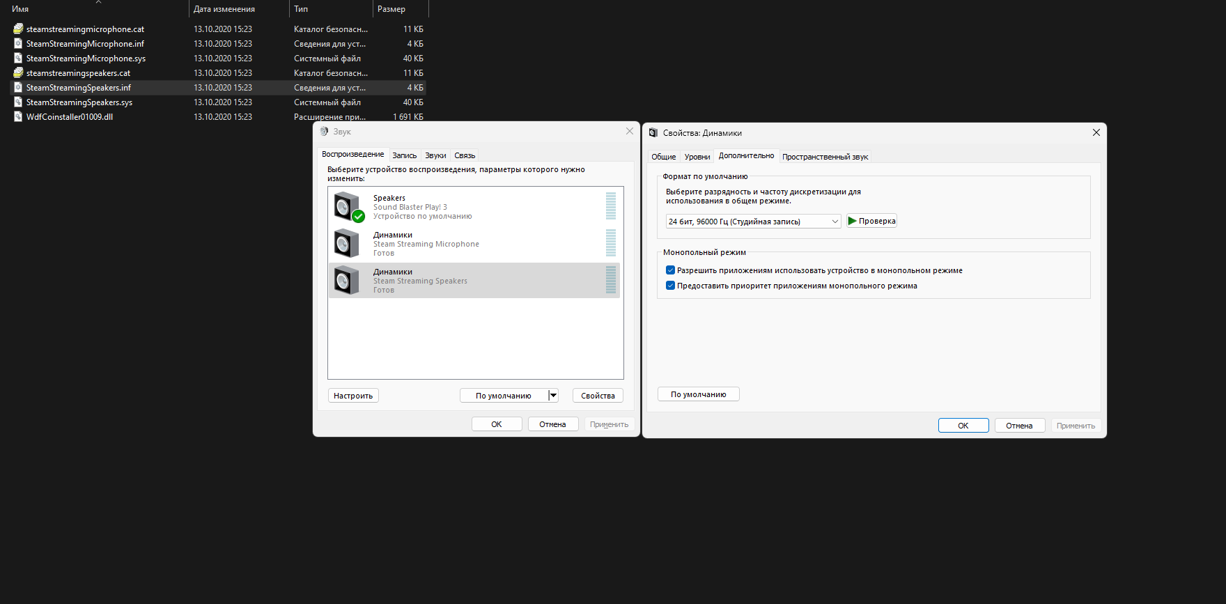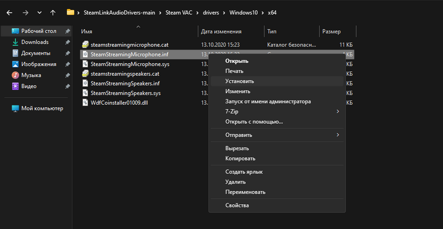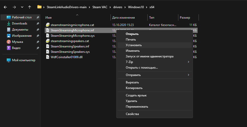 2. Распаковываем файлы в любое удобное место. Выбираем операционную систему и её разрядность. Через правый клик мыши выполняем установку файлов SteamStreamingMicrophone.inf и SteamStreamingSpeakers.inf.