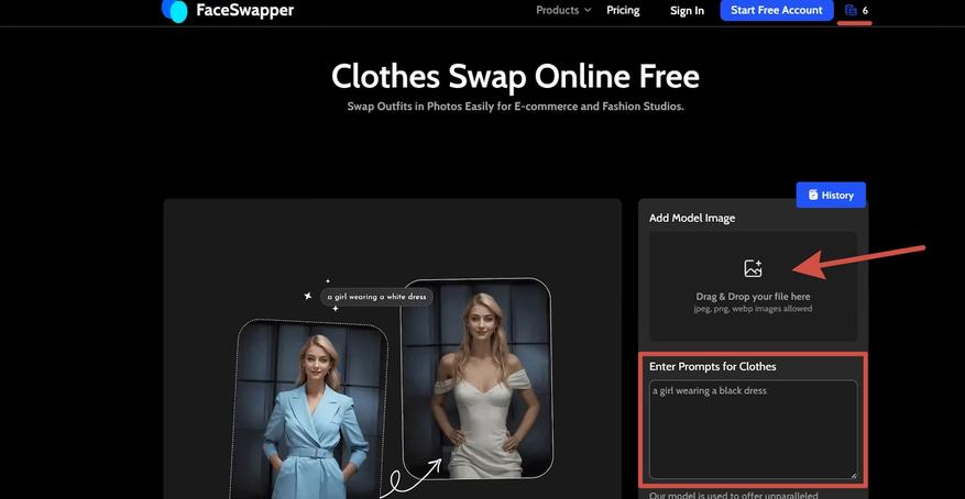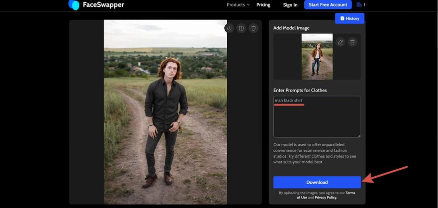 Следующий сайт — Face Swapper AI. Основной функционал — это изменение лиц на фото, но есть и замена одежды. Переходим на сайт, загружаем фотографию, а также пишем промт с указанием на конкретную одежду, которую хотим получить. Я напишу «man black shirt» (мужская черная рубашка).