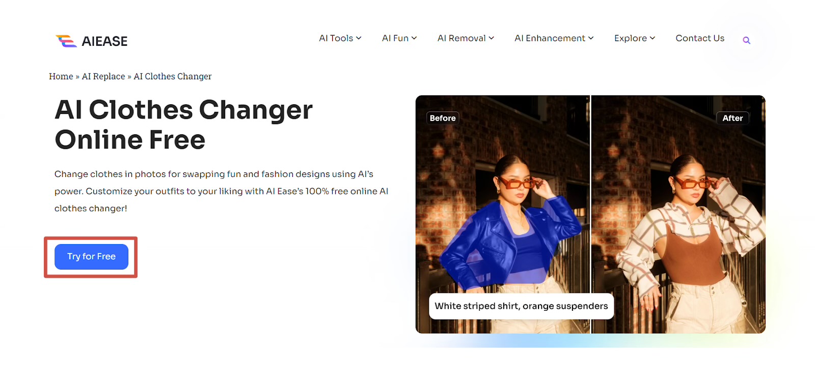 Первый сервис — AIEase. Он включает в себя множество инструментов, в том числе и изменение одежды. Переходим на сайт, нажимаем на кнопку «Try for Free» (попробовать бесплатно).