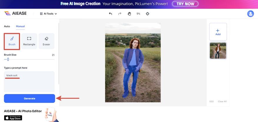 Есть два варианта: автоматическая замена или ручная. Автоматическая предполагает, что ИИ сам распознает, что и где вы хотите заменить. Для лучшей работы я выберу ручной режим. С помощью кисти или прямоугольника выделяем область, где находится сама одежда.
