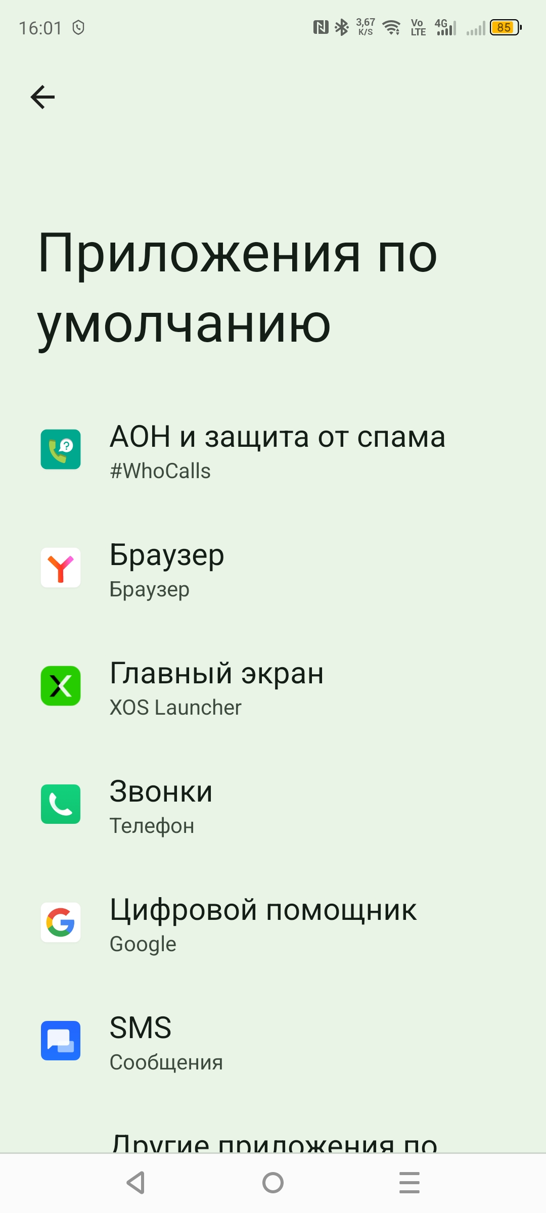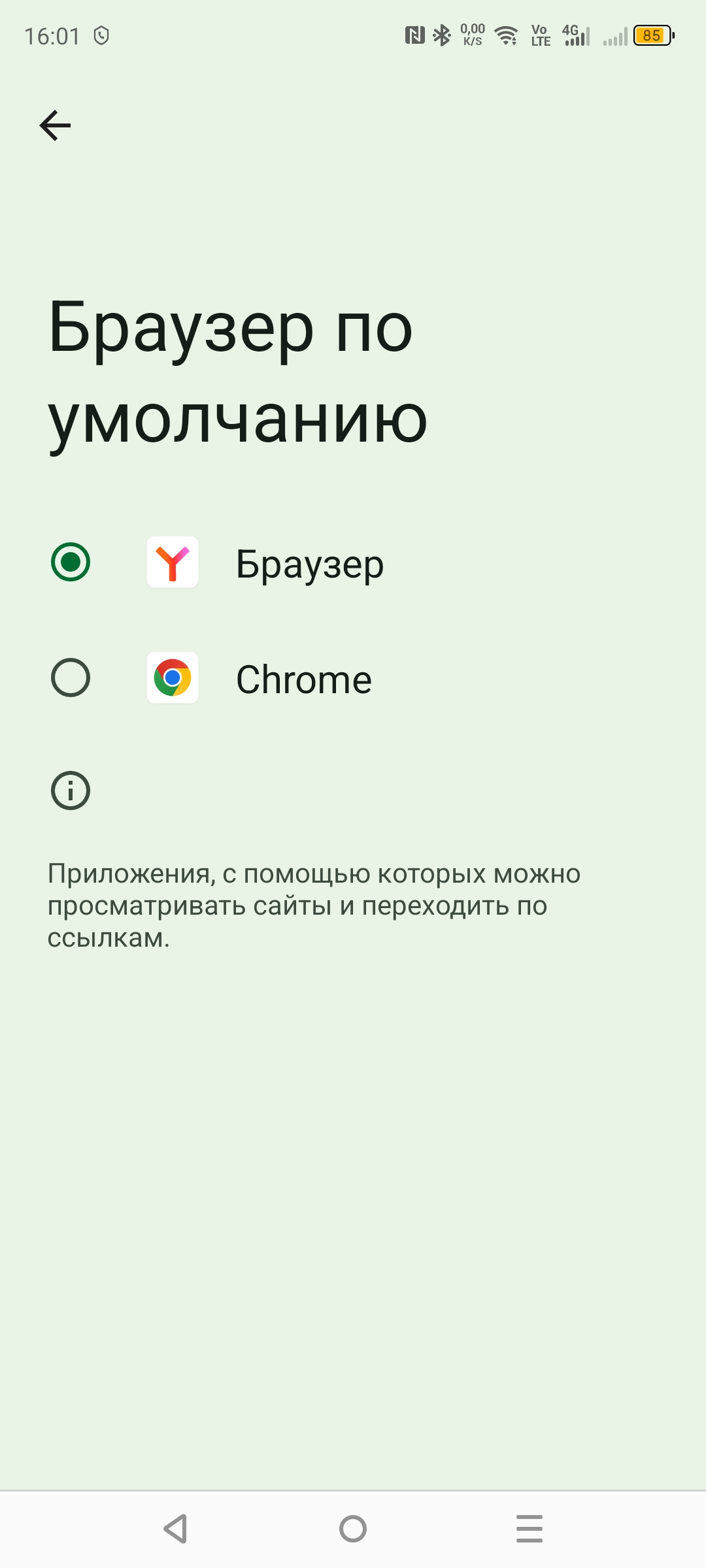 В данном случае вы попадаете в меню, где предоставлены основные сервисы смартфона, где можно выбрать для каждого сервиса свое приложение по умолчанию. В моем случае с завода установлен Chrome, но я отдаю свое предпочтение Яндекс Браузеру. В этом разделе будут появляться все установленные браузеры, поэтому вы легко и быстро сможете менять браузер по умолчанию.