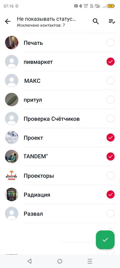 - Мои контакты, кроме…: В этом пункте вы выбираете те контакты, от которых хотите скрыть свой статус. Просто поставьте красные галочки напротив каждого контакта.