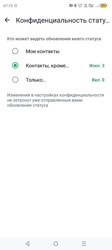 Вот так вот просто и быстро в пару нажатий можно решить проблему с ограничением видимости для нежелательных контактов вашего статуса. Выберите вариант, который лучше всего соответствует вашим потребностям.