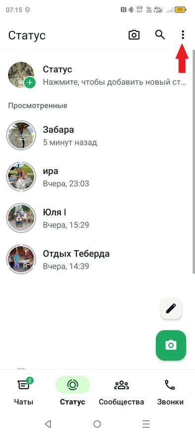 - Откройте WhatsApp на вашем устройстве. Затем перейдите в раздел «Статус».
