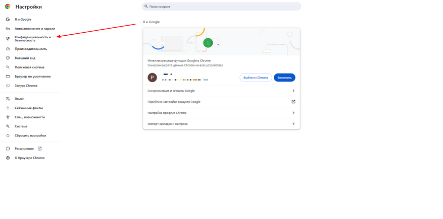- В левой колонке найдите и откройте подраздел «Конфиденциальность и безопасность».