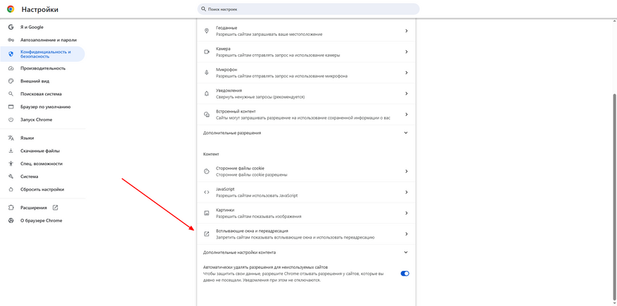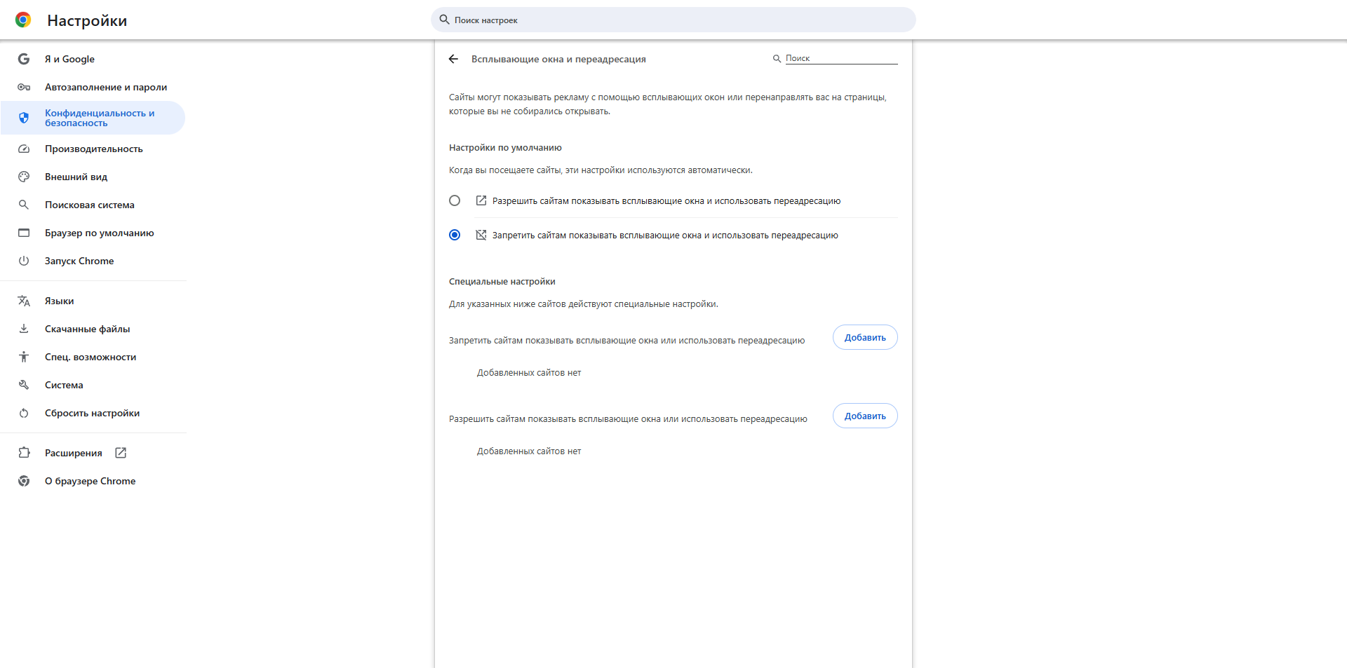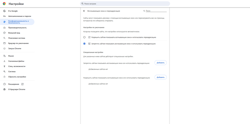 - «Запретить сайтам показывать всплывающие окна и использовать переадресацию» — стандартный режим, при котором система запрашивает разрешение.