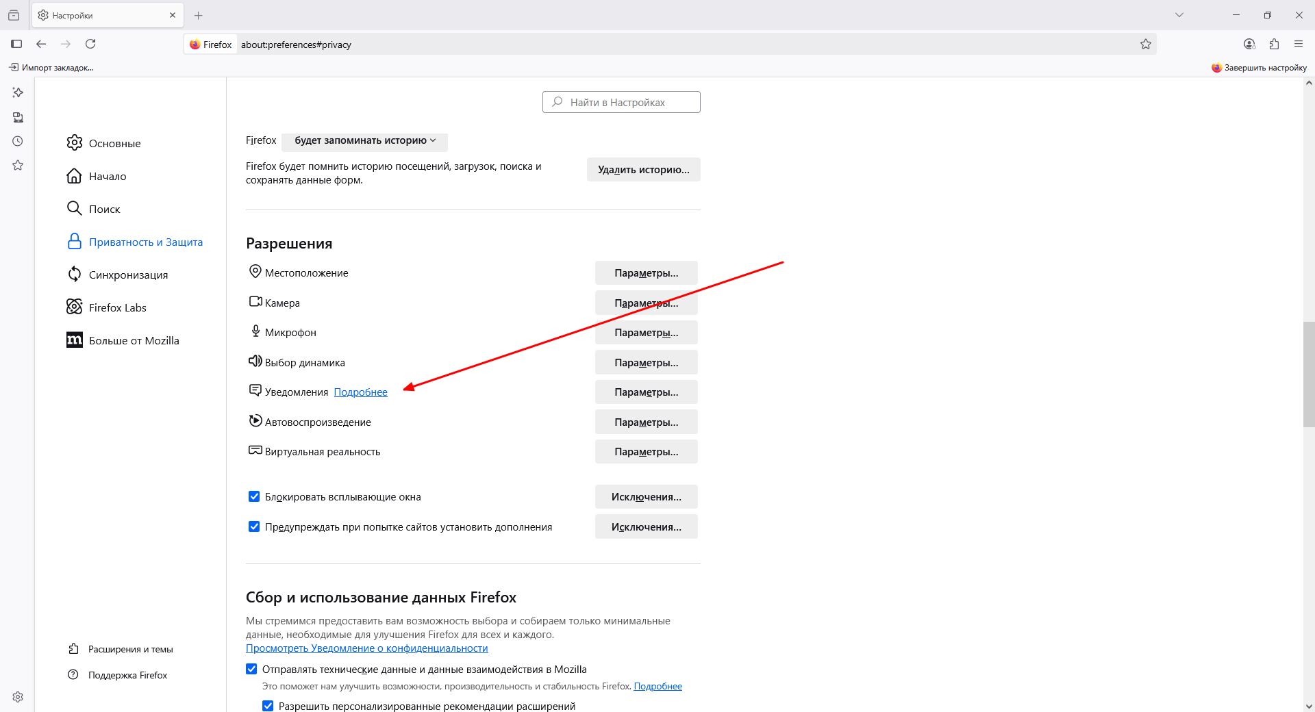 Для отключения пуш-уведомлений в Mozilla Firefox алгоритм действий следующий: