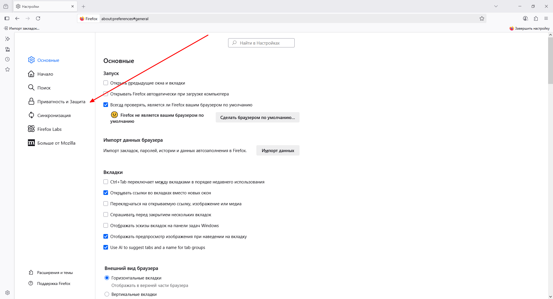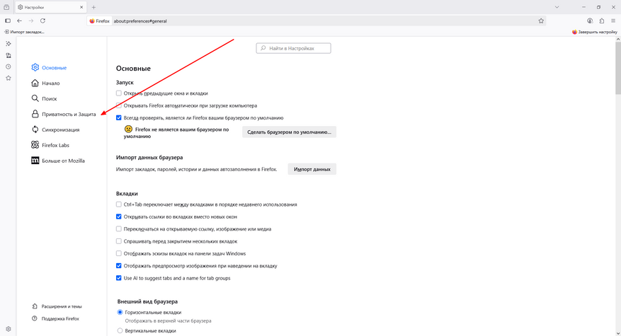 - Перейдите в «Настройки» — «Приватность и защита»