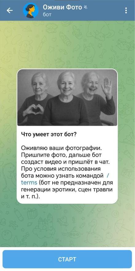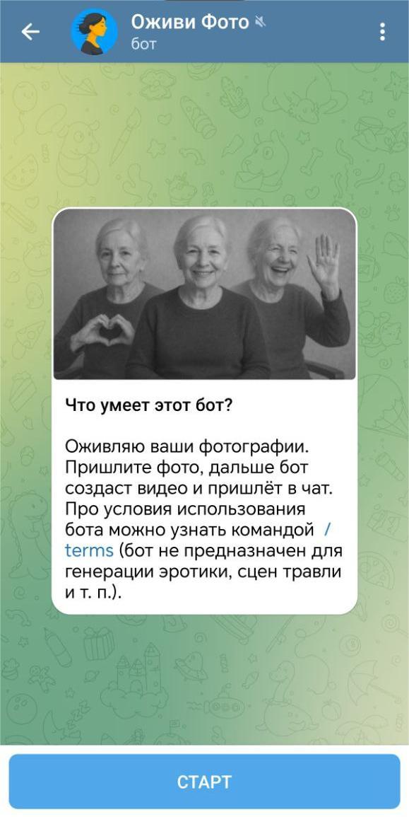 Удобный и, главное, простой в использовании телеграм-бот. Самый оптимальный вариант для пользователей, которые не собираются целый месяц оживлять по сотне фотографий, а, например, будут пользоваться сервисом время от времени.