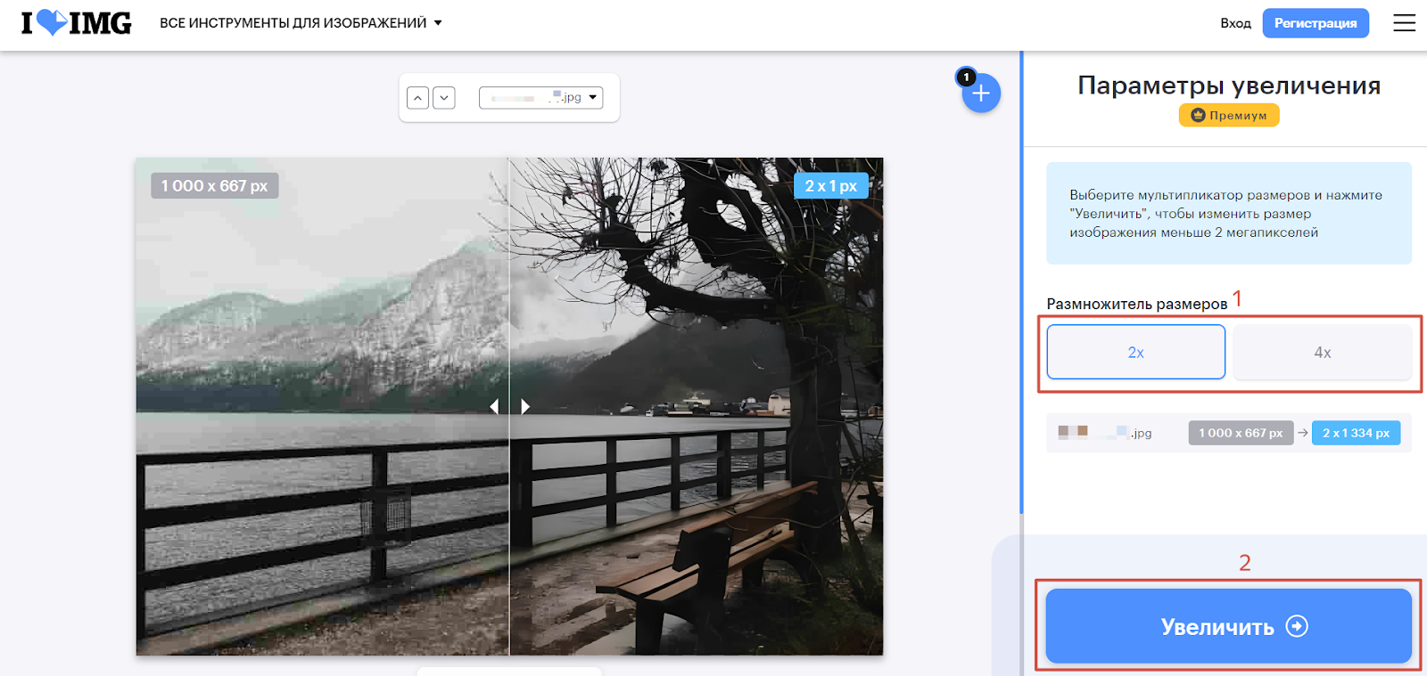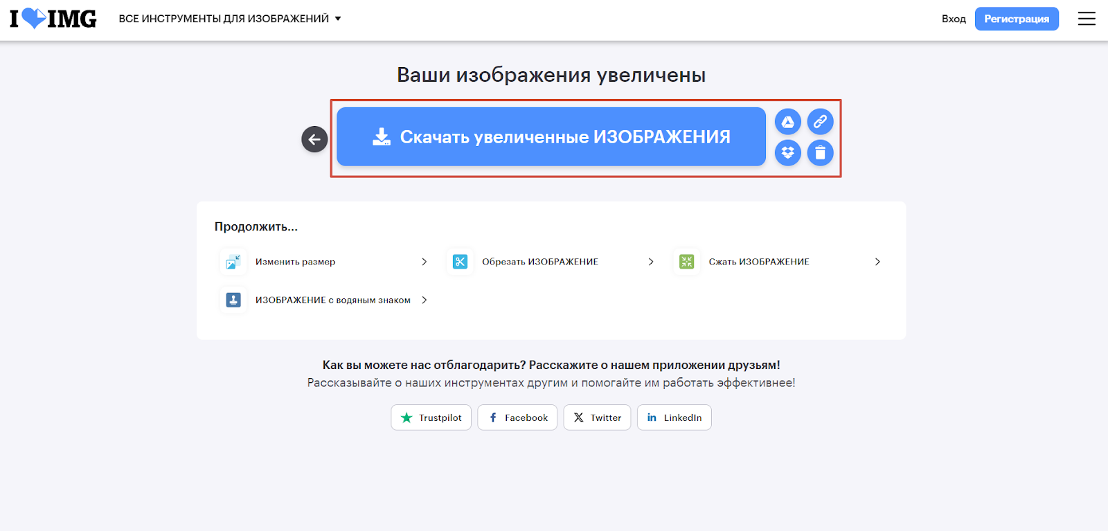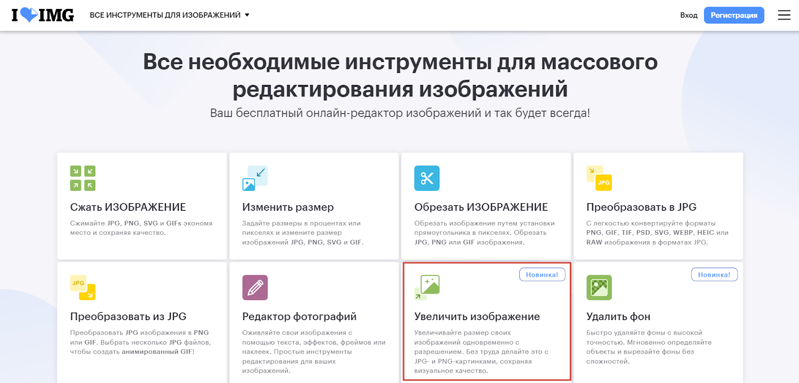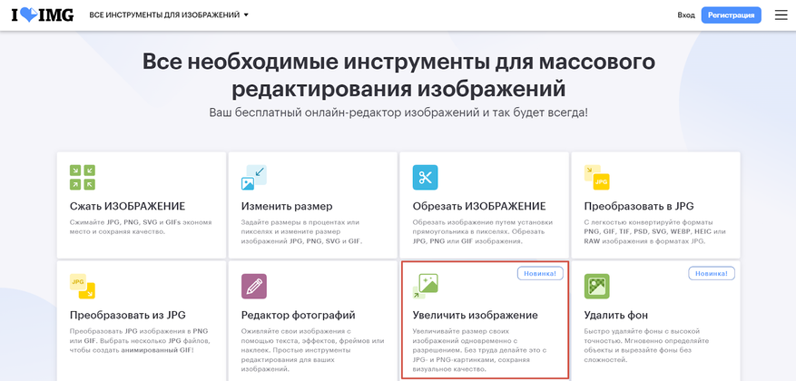 На сайте iLoveIMG вы можете выбрать инструмент Увеличить изображение.