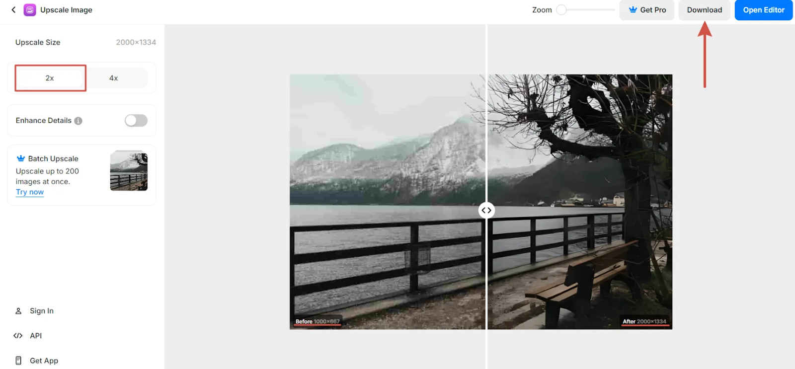 После нескольких секунд я получил результат. Выбрал увеличение в два раза. Четырехкратное увеличение доступно только с подпиской. Затем нажмите на кнопку «Download» (скачать).