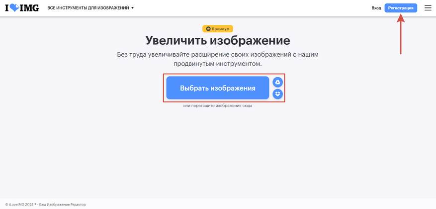 Можно зарегистрироваться, но инструмент работает и без этого. Нажмите на кнопку «Выбрать изображения».
