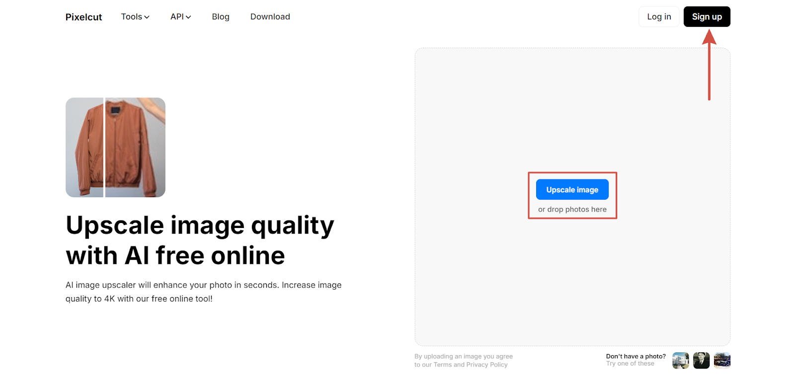 Перейдите на сайт Pixelcut, где можно зарегистрироваться или продолжить без регистрации. Нажмите на кнопку «Upscale image» (улучшить изображение). Можно также перенести фото с компьютера.