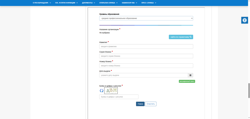 Вводим требуемые данные: фамилию, серию и номер бланка, дату выдачи, а также капчу.