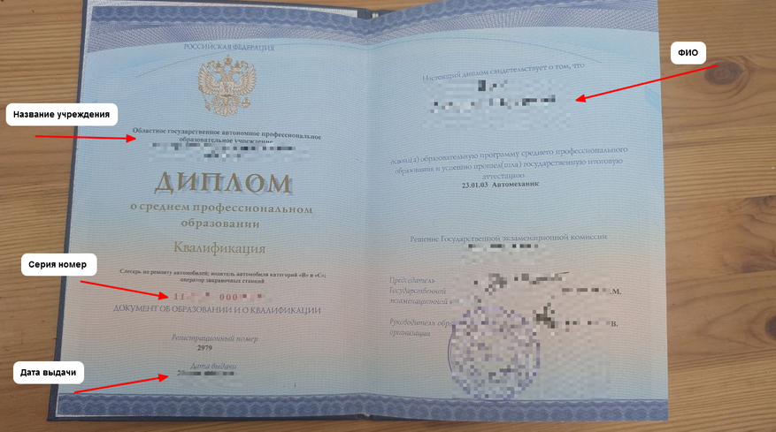 - Серийный номер диплома и дату его выдачи.