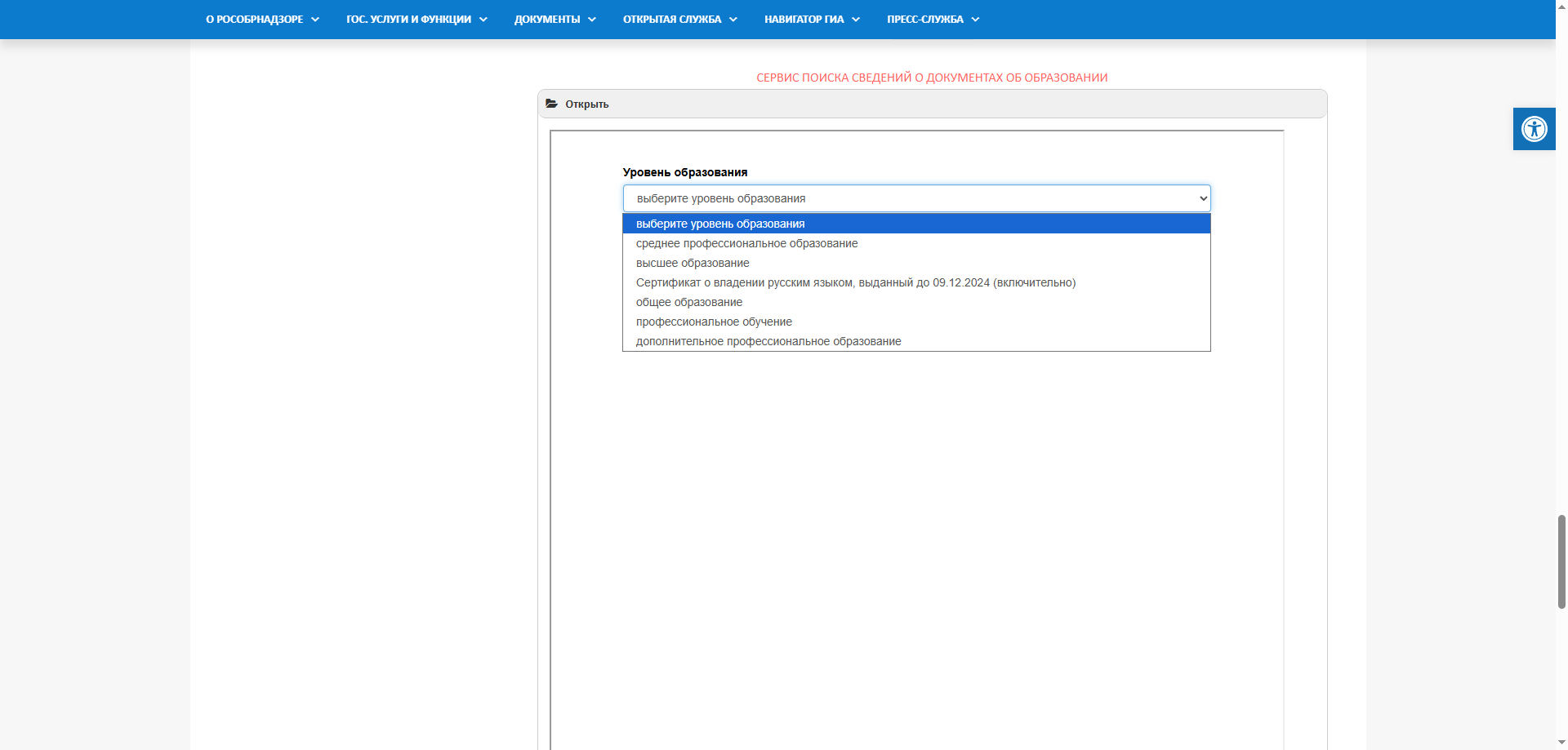 После этого необходимо выбрать уровень образования