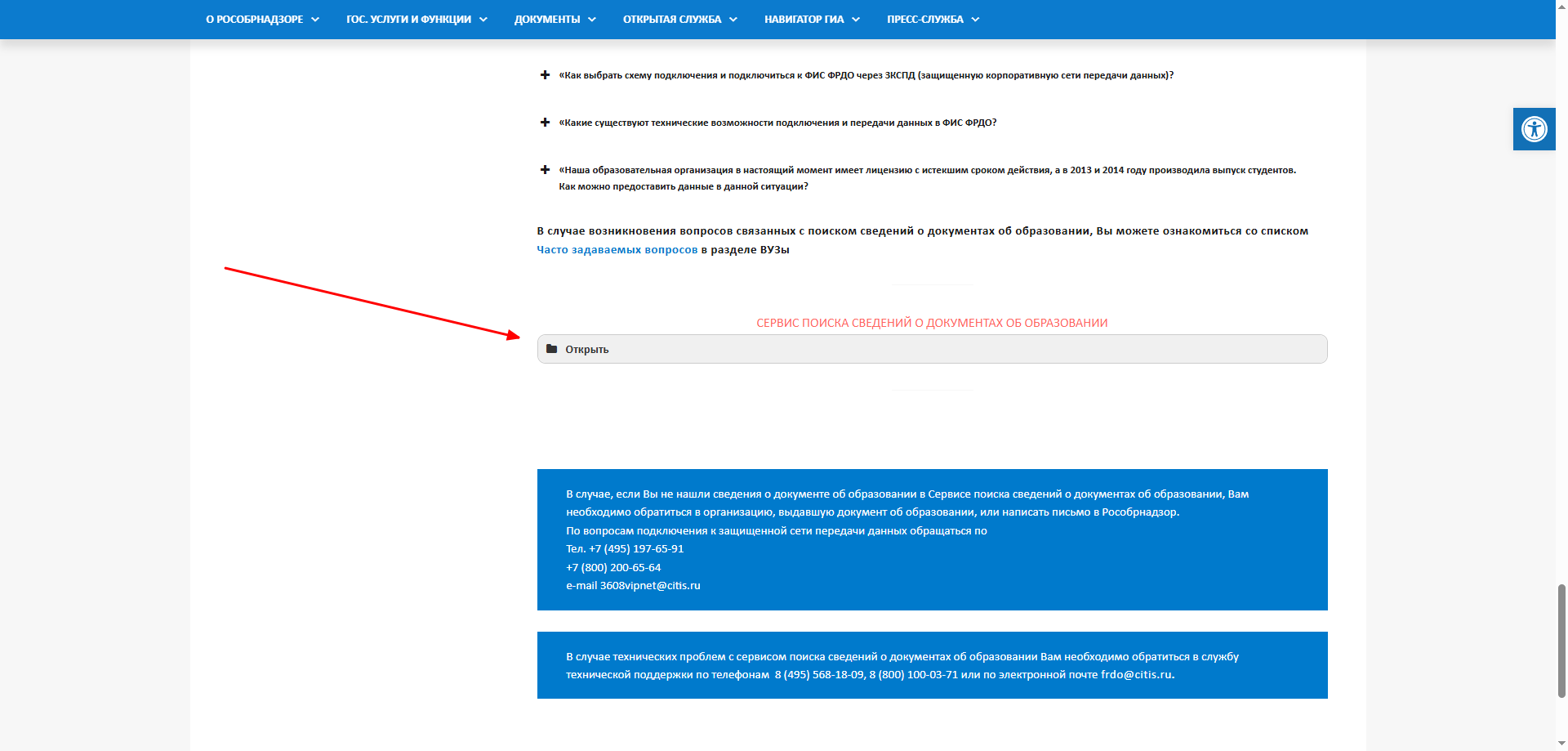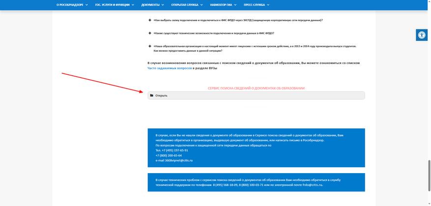 Проверить диплом можно на сайте ФРДО, в нижней части страницы находится специальный раздел для поиска информации о выданных документах. Откройте данный раздел.