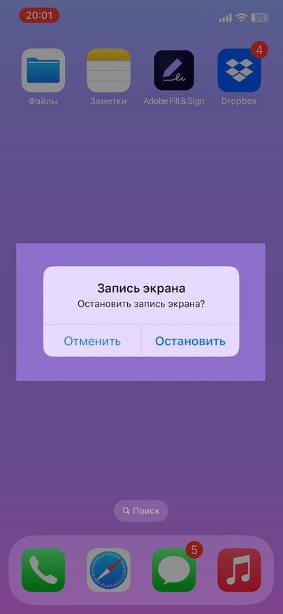 Альтернативный способ остановки записи — повторно открыть Пункт управления и нажать на ту же кнопку записи экрана.