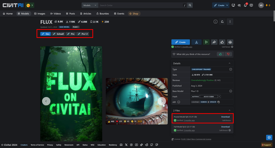 Следующий шаг — загрузка непосредственно модели Flux. Официальные версии Flux Dev и Schnell доступны на платформе CivitAI — крупнейшем сообществе энтузиастов генеративного ИИ в интернете. Если вы раньше не слышали об этой площадке, настоятельно рекомендую присмотреться внимательнее: там можно найти тысячи моделей, сотни тысяч субмоделей, а также невероятно активное сообщество разработчиков и художников.