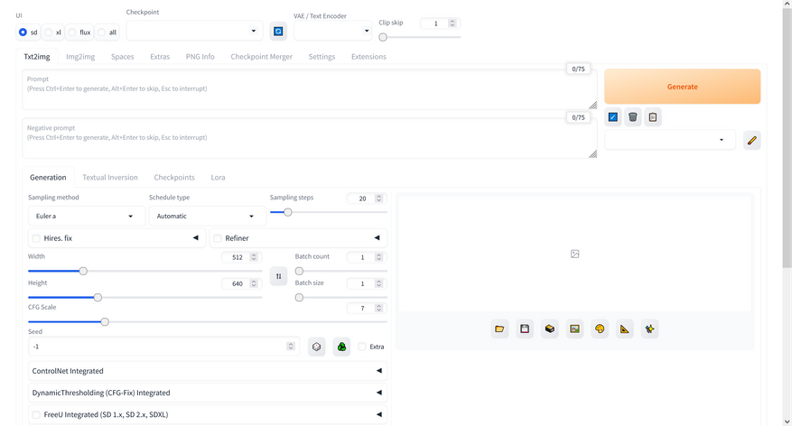 После завершения настройки можно приступать к генерации изображений. Пользовательский интерфейс во многом похож на классический AUTOMATIC1111, но имеет ряд важных особенностей и дополнительных элементов управления.