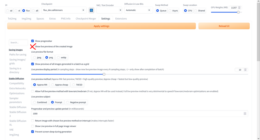 Первым делом необходимо отключить функцию предварительного просмотра: переходим в раздел Settings, выбираем вкладку Live previews и деактивируем соответствующую опцию. Функция предпросмотра практически бесполезна в реальной работе, но существенно снижает скорость генерации — на треть при достаточном объёме видеопамяти и вдвое при её дефиците.