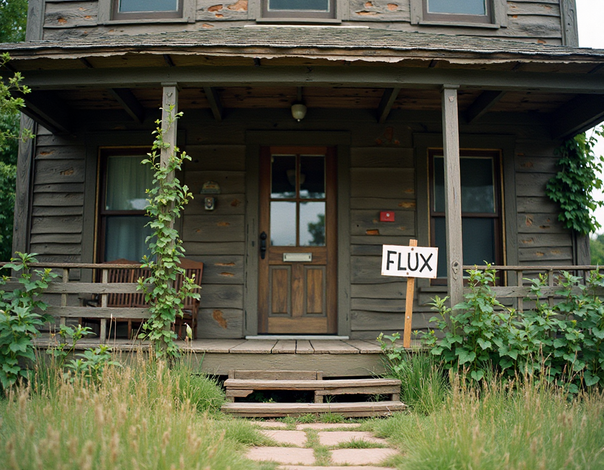 A weathered wooden house with peeling paint and exposed timber, dark brown and gray tones dominate the facade, wooden shutters hang slightly crooked on hinged windows. A wild overgrown garden surrounds the house, tall grass and wildflowers push through old stepping stones, climbing vines creep up the walls and wrap around porch pillars. A simple hand-painted sign reading «FLUX» in bold white letters hangs beside the worn wooden front door, the sign appears slightly faded and tilted. Captured on vintage 1980s film stock, with characteristic grain texture, slightly muted colors, and warm color shifts typical of aged photographs, light leaks visible in the corners add authenticity. The composition has subtle blur and soft focus areas, typical of cameras from that era, natural lighting suggests late afternoon with long shadows and golden undertones.