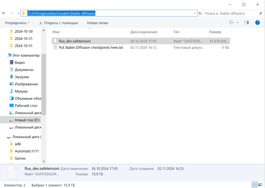 Облегчённую версию Dev nf4-v2 придётся скачивать отдельно — она размещена на платформе Huggingface. После загрузки файла модели необходимо поместить его в правильную директорию: откройте папку, куда был распакован Forge UI, найдите в ней подпапку webui, затем models, и внутри неё — stable-diffusion. Именно сюда следует поместить скачанный файл модели. Важное замечание: в отличие от моделей Stable Diffusion, для Flux не требуется отдельный VAE-файл.