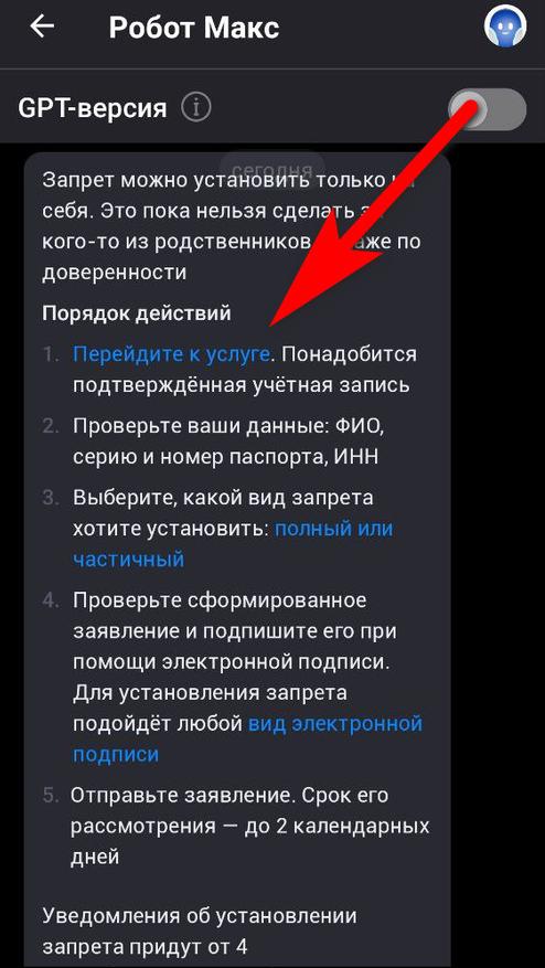 Итак, шаг 1: идём на ГосУслуги, где видим сверху, там где популярные запросы, плашку «самозапрет» (да-да, та самая, куда показывает стрелка). Щелкаем по ней, открывается чат с Роботом Максом (шаг 2), в котором можно подробнее узнать про самозапрет. Видите пункт 1 «Перейдите к Услуге»? Жмите на него и откроется шаг 3. Там внизу будет кнопка «начать», которая на влезла в скриншот.