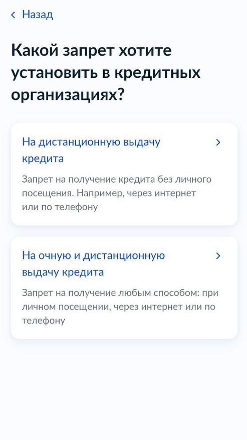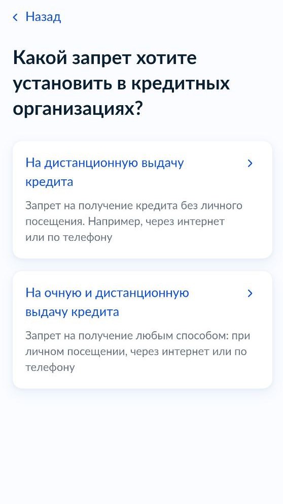 Дальше на шаге 8 можете выбрать уточнить какой именно запрет выдачи кредитов вы запрещаете: только на дистанционную (через личный кабинет или по телефону, вы сможете взять кредит при личном визите) или вообще любую (очную и дистанционную) выдачу кредитов.