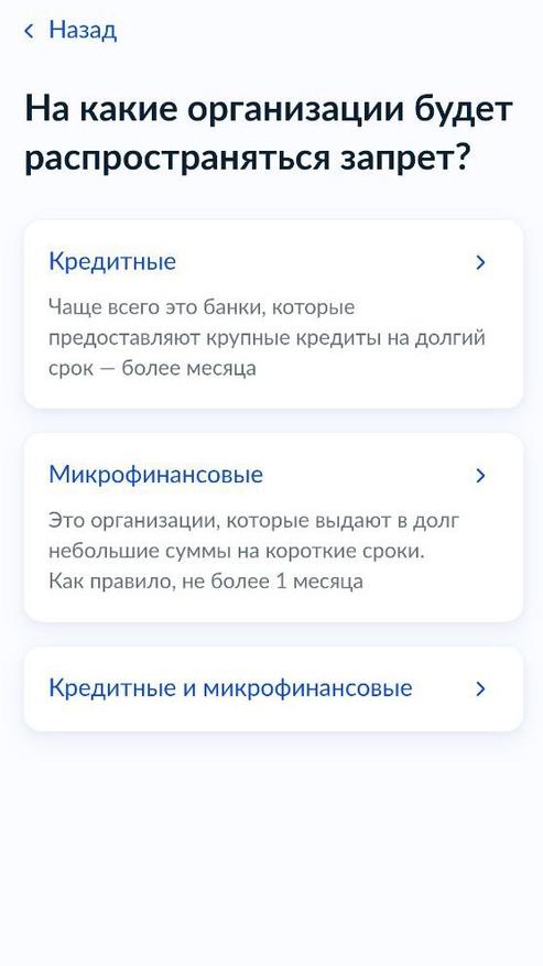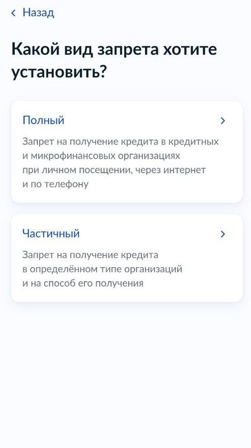 На шаге 7 вам предложат выбрать тип самозапрета: полный или частичный. Чем они отличаются? Частичный запрет на выдачу кредитов означает что на этом шаге вы выбираете организации, где именно не будут выдаваться кредиты: кредитные (то, что покрупнее,