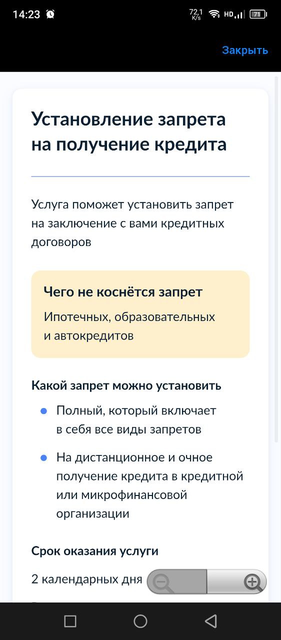 Стоит уточнить. Установить самозапрет на кредиты можно двумя способами: долго (лично обратиться в МФЦ и, насколько понимаю, доступно еще не везде) или быстро (собственно, через ГосУслуги). И разница по затраченному времени между обоими способами просто колоссальная. Помнится, мой прошлый визит в МФЦ отнял несколько часов, тут же установление запрета заняло буквально полторы-две минуты — определенно меньше, чем я обдумывал текст этого абзаца.