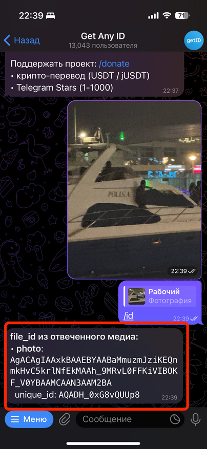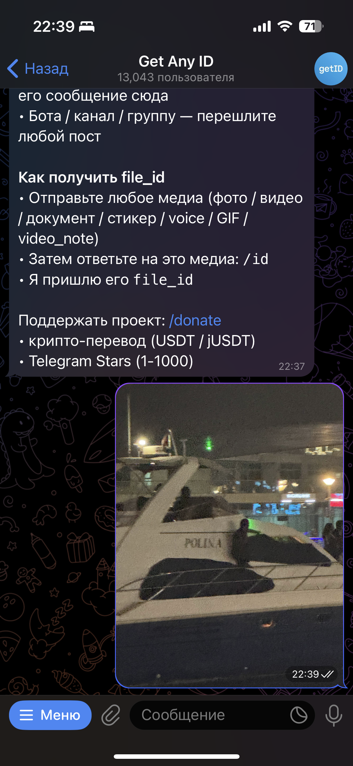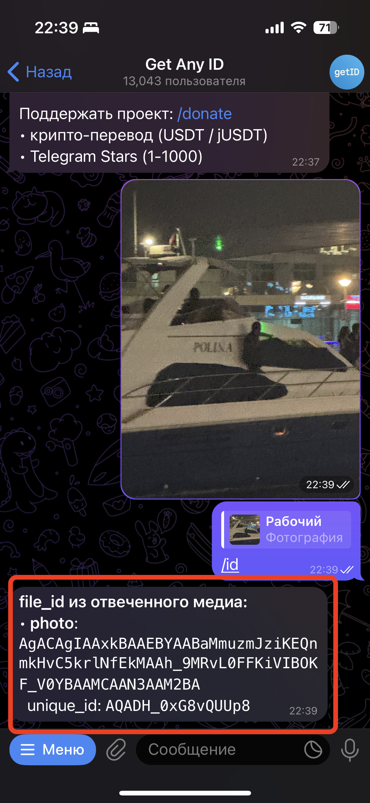 У читателя может возникнуть вопрос «какие файлы могут иметь этот самый айди (точнее file_id)?». Почти любые вложения: фото, видео, анимация (GIF), документ, аудио, голосовое, видеокружок, стикер (статический/анимированный/видео), вложения в альбомах. Да-да, у каждого из этого есть свой ID. Если идти дальше, то, к примеру, у фото Telegram обычно несколько размеров — у каждого свой file_id. Обычно берут самый большой.