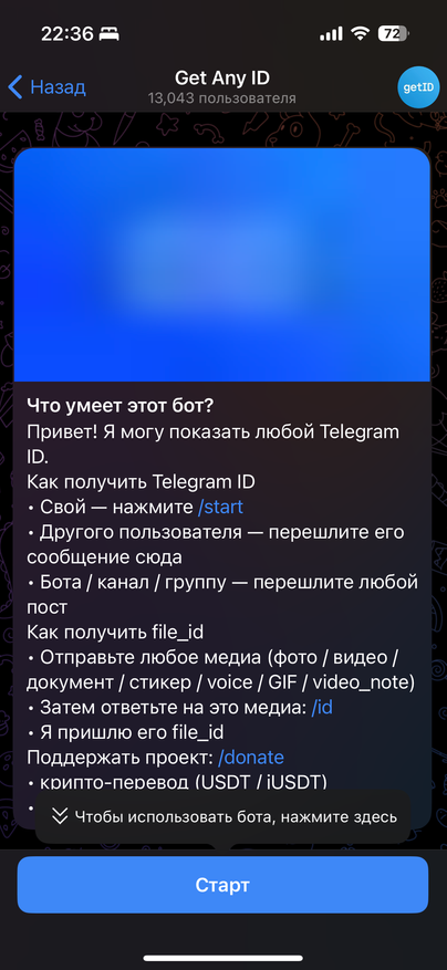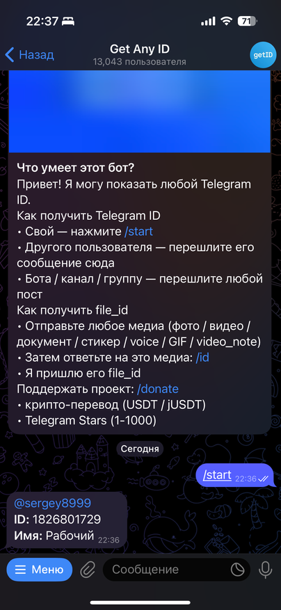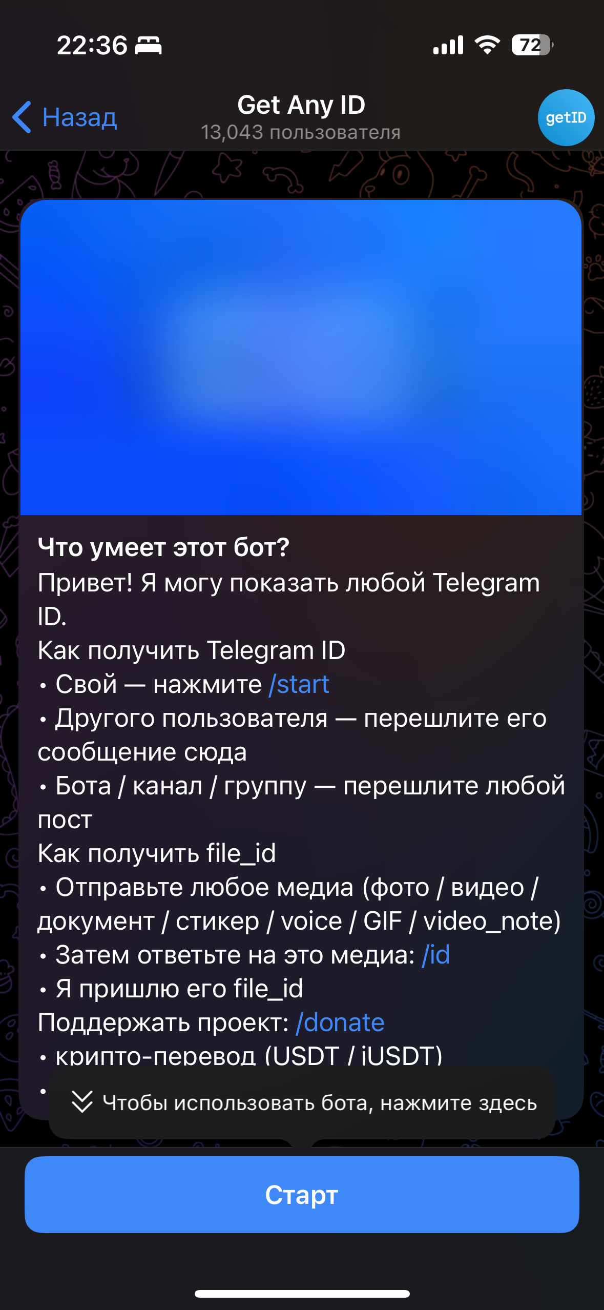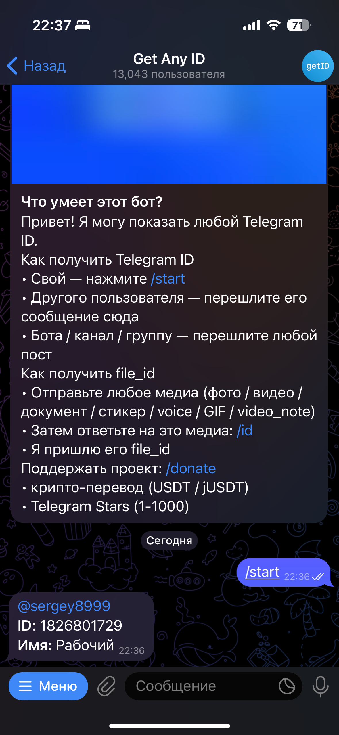 Если хотите узнать свой ID или просто СКРЫТЬ свой ID (это делается в настройках внутри телеграмма), то прочитайте статью — Как узнать свой ID в Telegram и не только: пользователя, чата, бота, группы или канала.