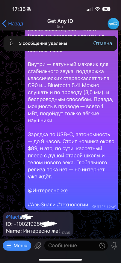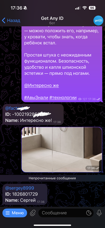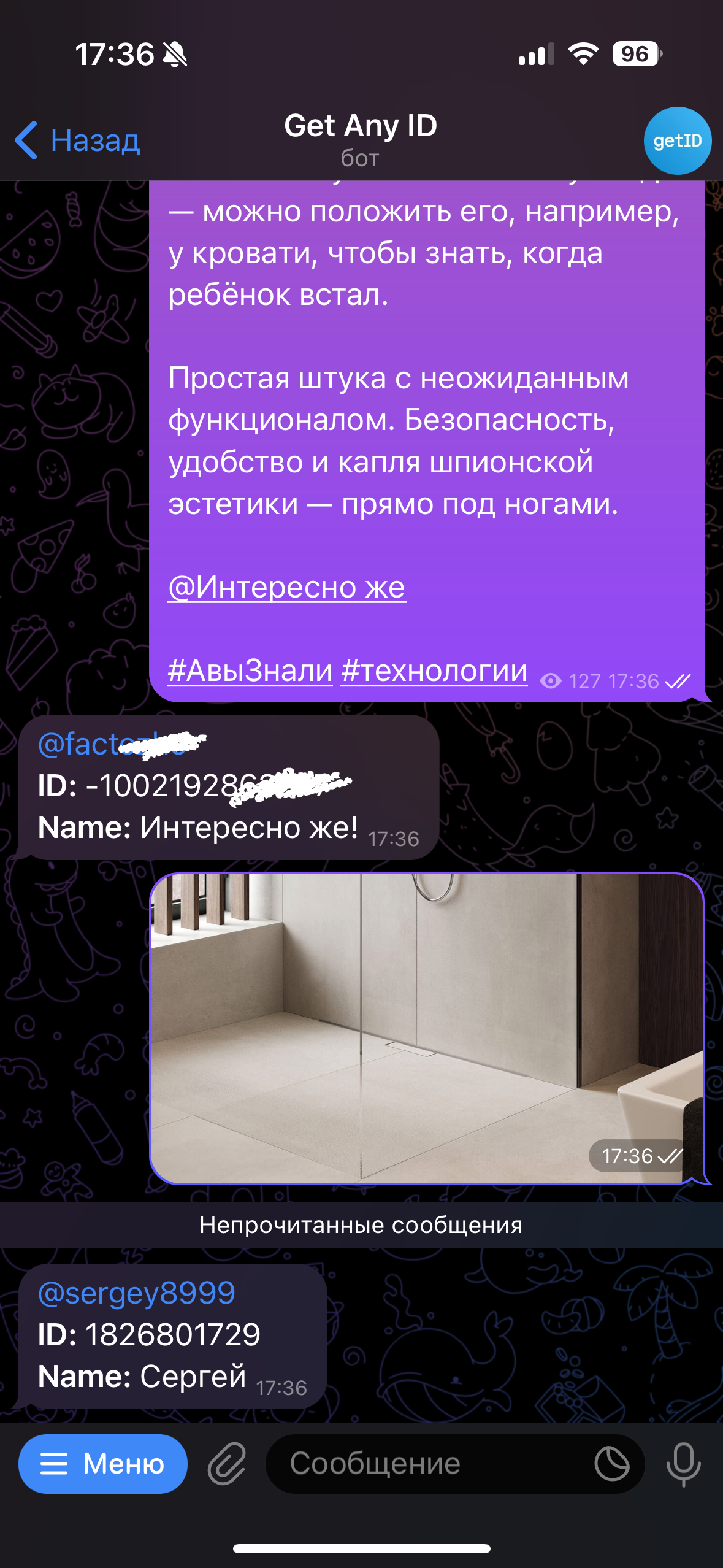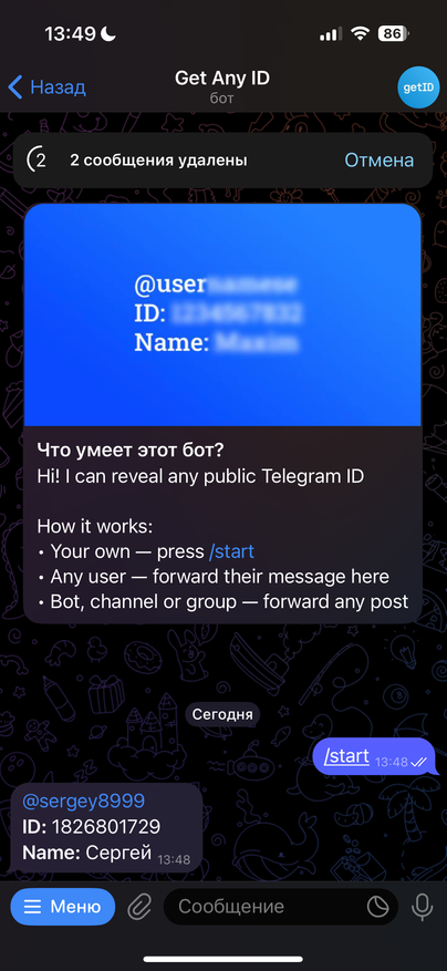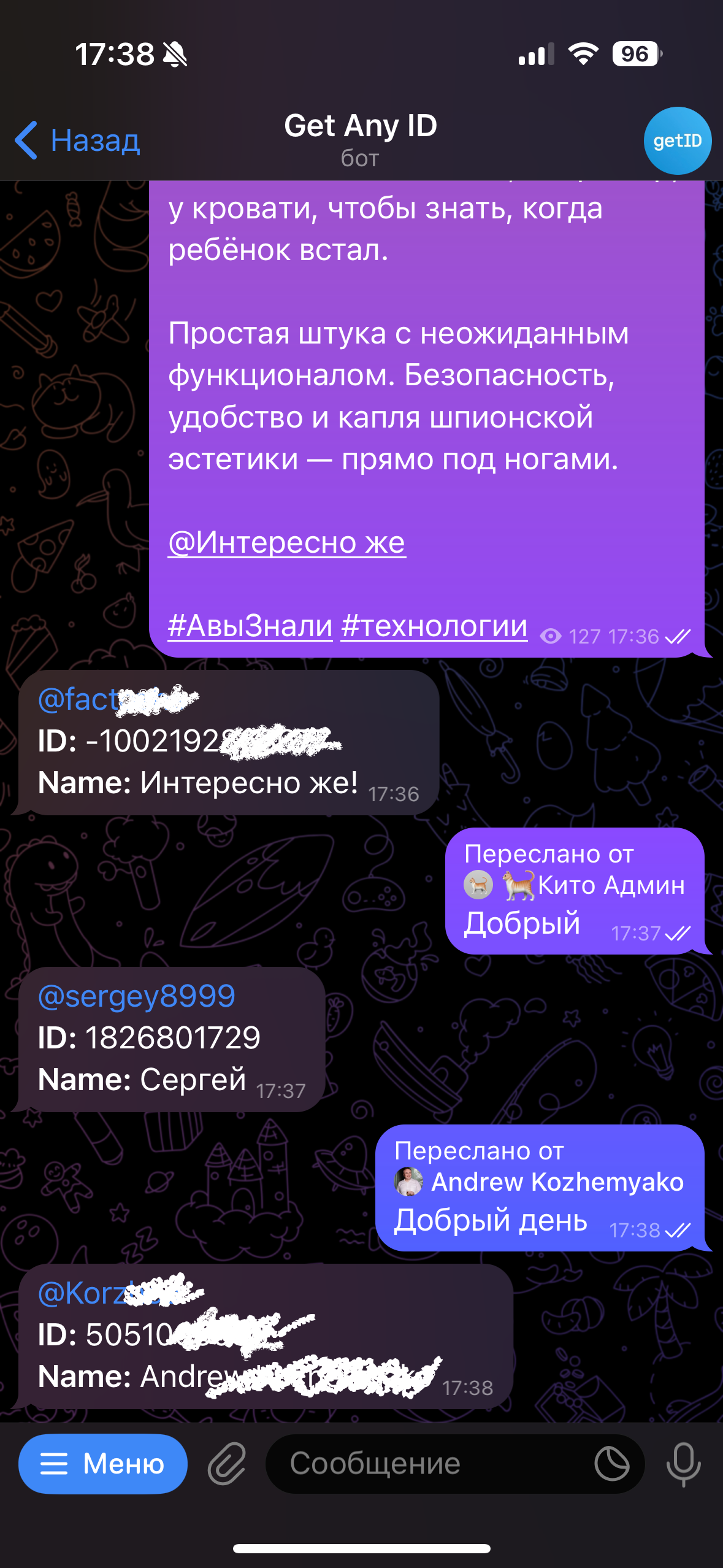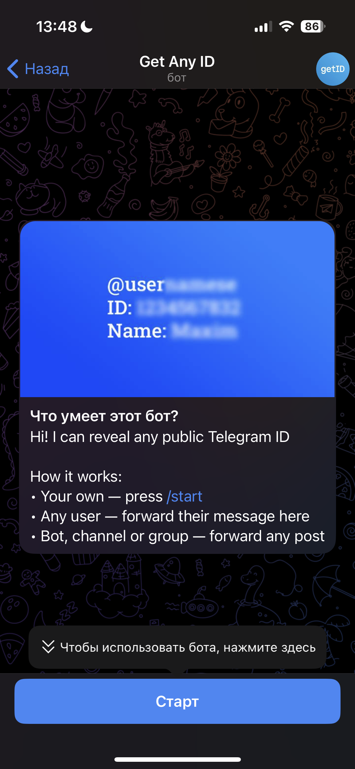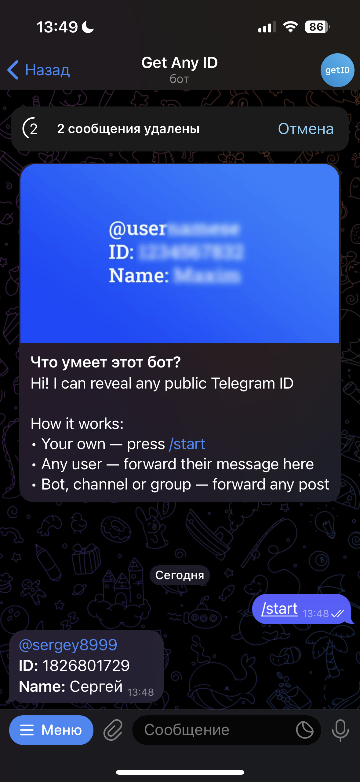 - Через специальные Telegram-боты, например @TheGetAnyID_bot.
