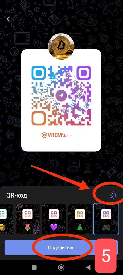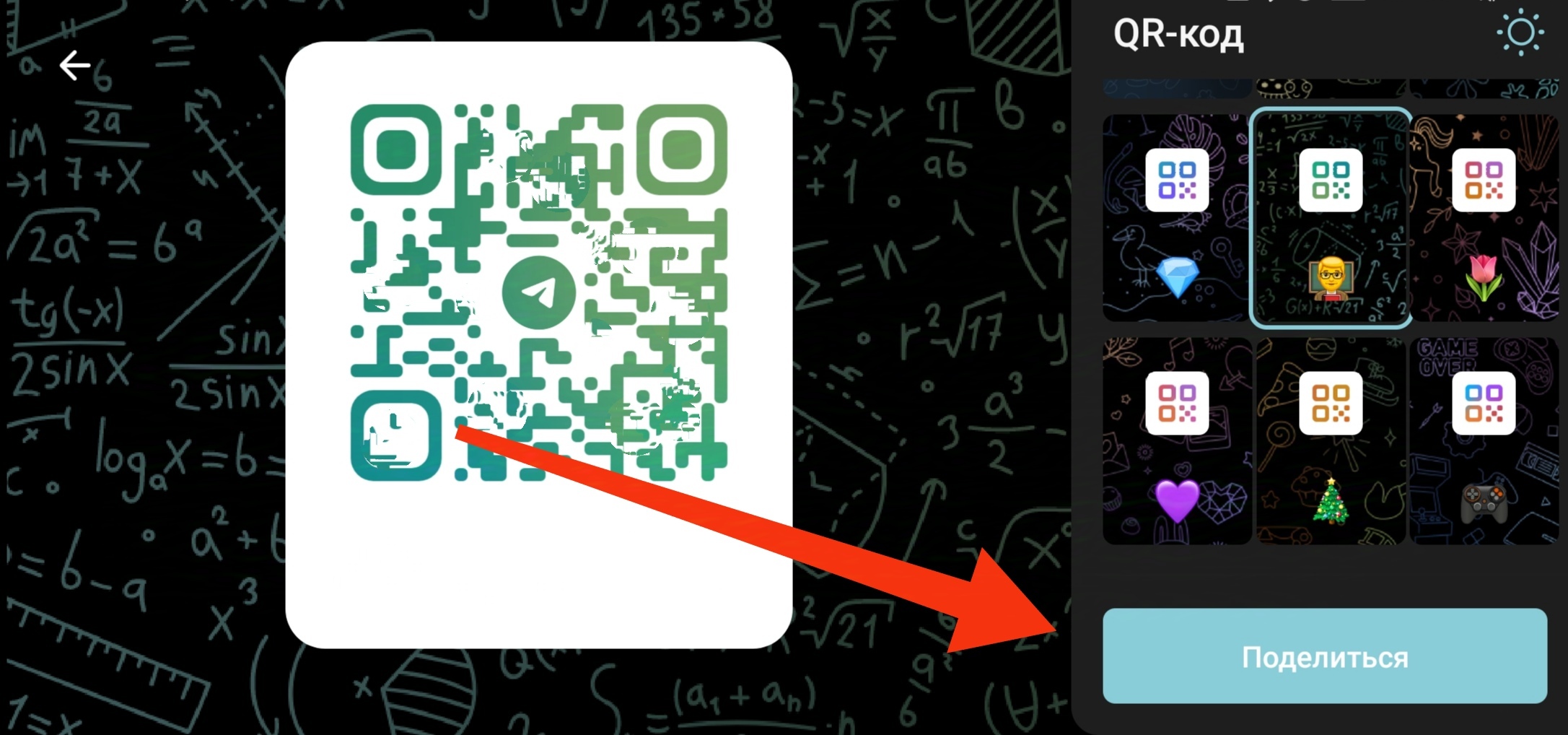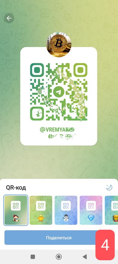Но это ещё не всё, месенджер предлагает сразу немного стилизовать ваш QR-код. Внизу перед кнопкой «поделиться» есть несколько графических тем, которые можно выбрать в качестве фона для вашего кода, также справа, вверху от тем, есть кнопка выбора цветовой схемы в темных или светлых тонах. Также обращаю ваше внимание, что цветораспределение фона своего рода анимированное, то есть, если задержаться на несколько секунд на одной теме, цвет фона начнет медленно меняться и зафиксируется на том моменте, когда вы нажмете кнопку «поделиться». К сожалению, на этом встроенные возможности графического редактирования кодов заканчиваются.