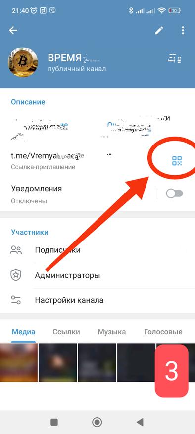 В появившимся окне нужно найти строку с обычной ссылкой на ваш канал, напротив нее будет специальная иконка в виде QR-кода, нужно кликнуть на нее. И вот мы уже на завершающем этапе. На главном экране мы уже можем наблюдать сгенерированный QR-код к вашему Telegram-каналу. Вы уже можете нажать кнопку «поделиться» и отправить полученный код в виде картинки любым доступным для вас электронным способом.