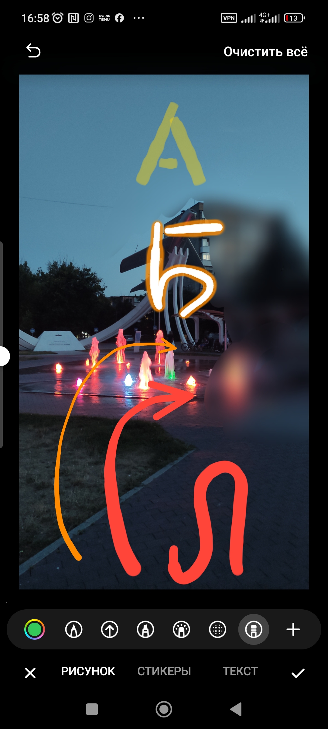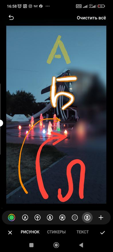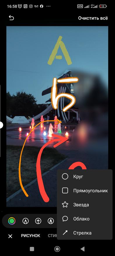 Средняя иконка отвечает уже за более широкий спектр функций редактора. Для начала с левой стороны экрана вы можете выбрать толщину рабочей кисти. Внизу можно выбрать необходимый вам цвет. Далее можно рисовать стрелки, что очень удобно, к примеру, чтобы объяснить человеку, как и куда правильно пройти. Можно добавить иконки диалогов, круги, прямоугольники и прочие фигуры. Также доступен широкий спектр различных кистей. В общем разберётесь, здесь нет ничего сложного. Дополнительно стоит отметить, что на изображение можно добавить текст, смайлы и анимированные стикеры. При желании предпоследний инструмент убирает всё наше творчество в выбранной зоне.