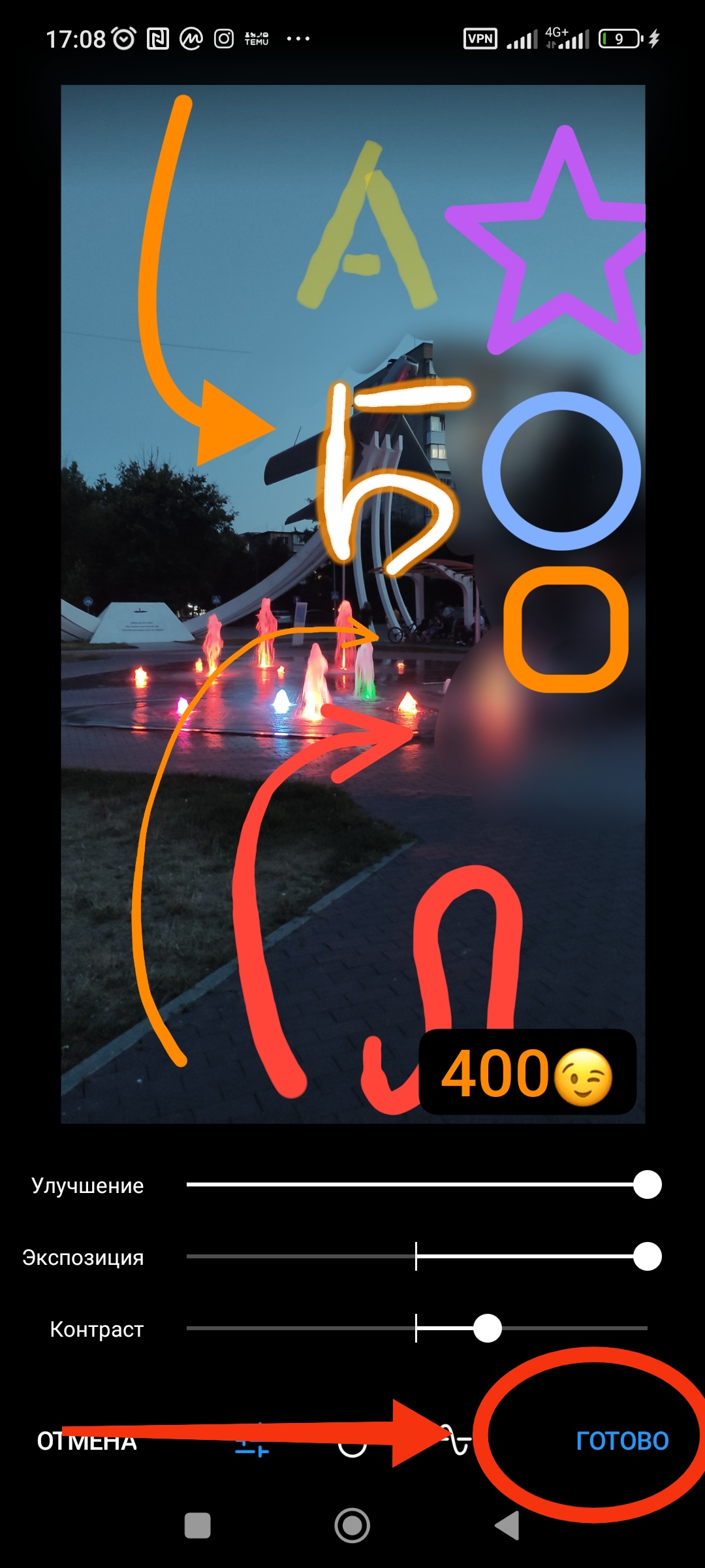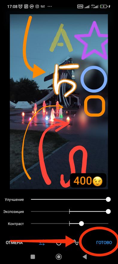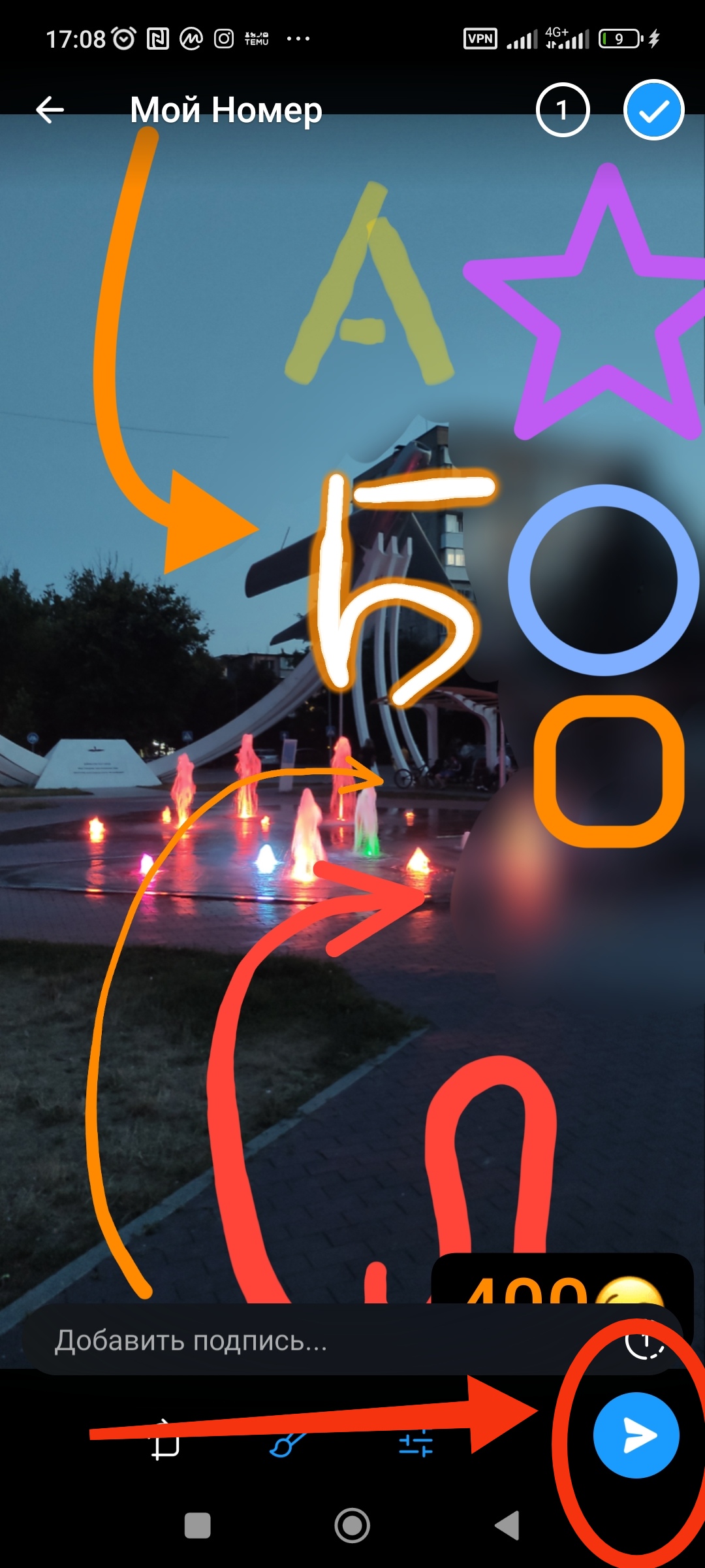 После того как вы внесли все изменения в фото, нажимаем кнопку «готово», а затем жмём привычную нам стрелочку отправки сообщения.