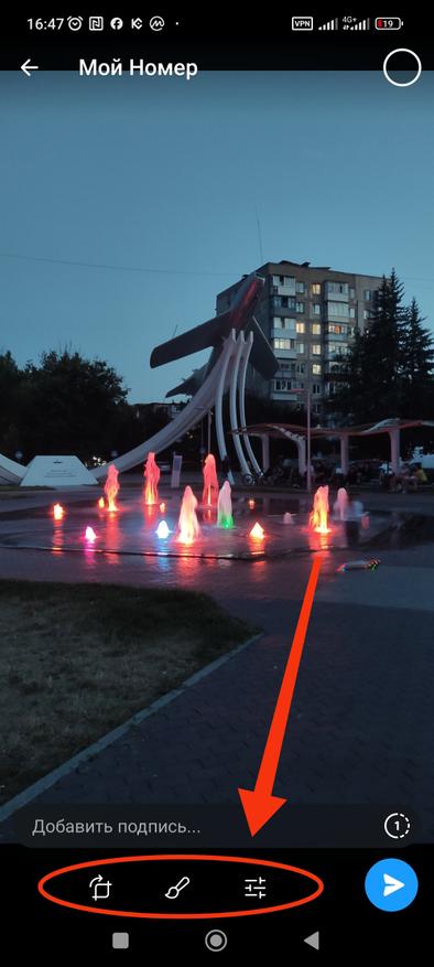 Причем, следует помнить, что нажать нужно на само изображение, а не на маленький кружочек в правом верхнем углу нужного вам фото. В противном случае вы просто перейдете в режим выделения нескольких фото для отправки без редактирования. После того как фото выделено, внизу нам доступны три иконки, отвечающие за функциональность встроенного редактора.
