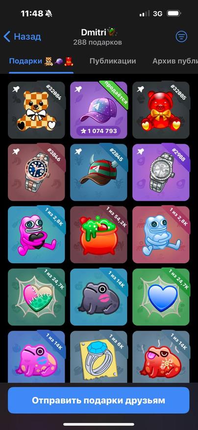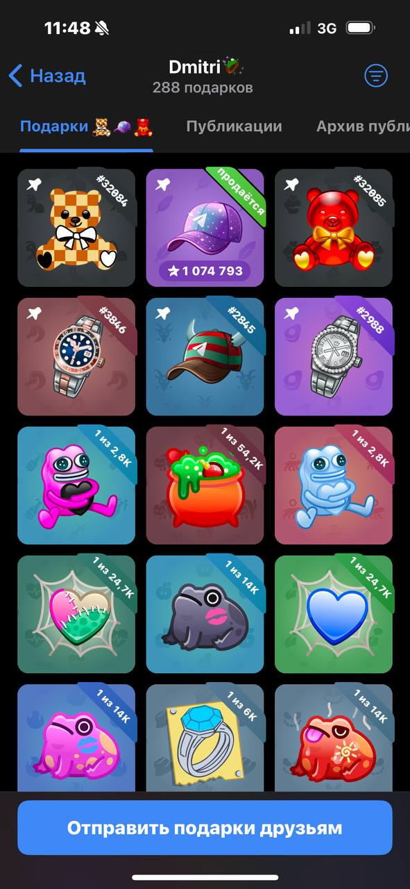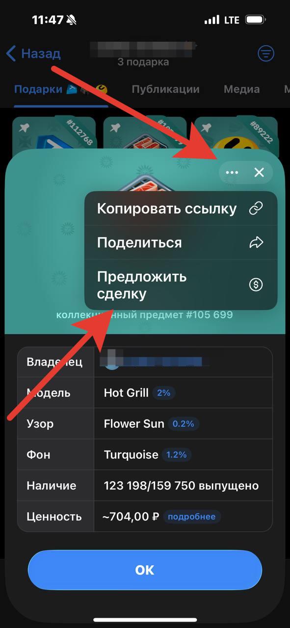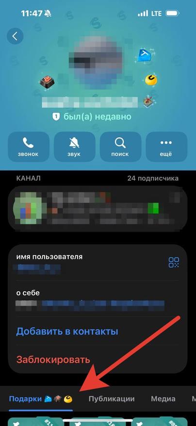 Для начала необходимо перейти в профиль пользователя, у которого есть интересующий нас подарок. Найти пользователя с той или иной моделью можно в разных мини-приложениях, но в этом гайде я рассмотрю именно процесс выставления оффера на уже найденный подарок. Перейдя в профиль пользователя с интересующим нас подарком, спускаемся ниже, под описание профиля, и находим вкладку «Подарки». Если подарок скрыт или является главным в профиле, выставить оффер нельзя, поэтому находим именно незакрепленный предмет коллекционирования и нажимаем на него.