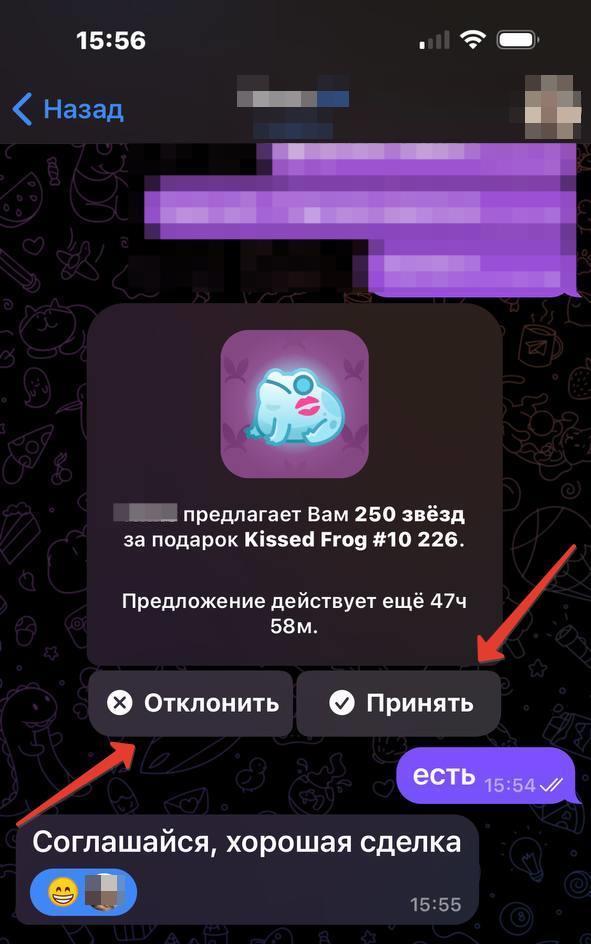 Если пользователь отклоняет оффер, средства возвращаются на ваш аккаунт. Если пользователь принимает оффер, то он получает средства за вычетом комиссии: 20% для Stars и 10% для TON. Также стоит отметить, что при принятии оффера появляется дополнительное окно, в котором пользователя уведомляют, сколько Stars или TON он получит на свой баланс, а также насколько рыночной является эта сделка.