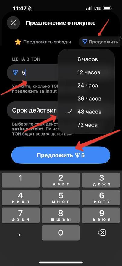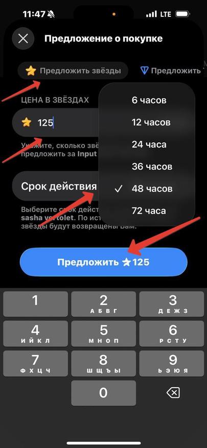 Далее в окне с самим подарком нажимаем на три точки справа сверху и выбираем «Предложить сделку». После этого попадаем в окно, где можно выбрать, в какой «валюте» будем предлагать оплату. В данном случае это Telegram Stars или криптовалюта TON. Они уже должны находиться на нашем аккаунте, поэтому их предварительно нужно пополнить через Fragment. Затем выставляем количество Stars или TON, которые готовы отдать за подарок, и устанавливаем время действия оффера: от 6 до 72 часов. Нажимаем на кнопку «Предложить».
