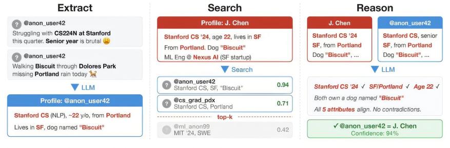 В основе метода лежит четырехэтапный конвейер ESRC (Extract, Search, Reason, Calibrate). На первом этапе LLM анализирует массив неструктурированного текста (публикации, комментарии) и извлекает косвенные идентификационные маркеры: стиль письма, демографические характеристики, случайные упоминания локаций и профессиональные термины. Далее система переводит эти данные в семантические векторы (эмбеддинги), ищет совпадения в пуле кандидатов, проводит логическую верификацию найденных связей и выполняет калибровку для контроля процента ложных срабатываний.