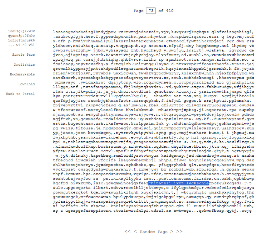 Так, например, первая страница во втором томе будет обозначаться числом 411 (410 от первого тома + 1 от второго). Это число потом служит для генерации уникального сида в привычной нам десятеричной системе и переводится в двадцатидевятеричную (26 букв алфавита, пробел, точка и запятая), которую мы и видим на странице в виде комбинации символов. Благодаря этому библиотеке не приходится выделять огромные объёмы памяти для хранения книг.