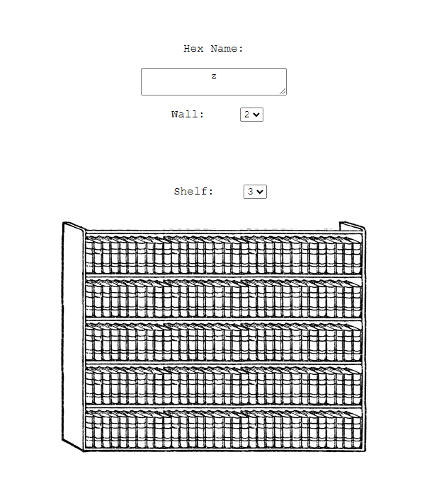 Каждая книга закодирована в следующем формате: nnnnnnn(n)-w1-s1-v1, где первое число — номер шестиугольника, представленный в тридцатишестеричной системе счисления, второе — стены, третье — полки, четвертое — тома. Но самое интересное — в том, что текст генерируется, игнорируя номер тома. Вся полка считается за 13120 страниц (32*410), каждая страница уникальна. Этот номер как раз и служит для генерации текста.