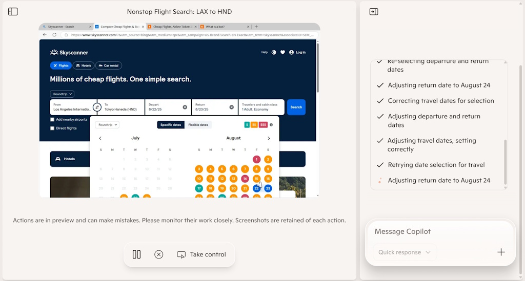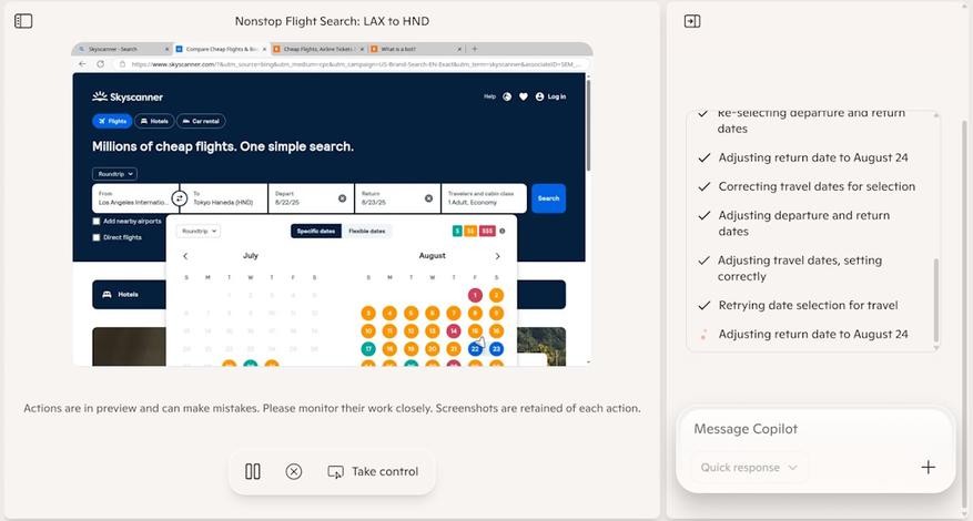 Microsoft сообщает, что Copilot Mode записывает скриншоты каждого шага в режиме «Action» и собирает данные о действиях пользователя во время сеансов. В будущем планируется добавить возможность доступа к личной истории и учетным данным, что позволит ИИ выполнять более сложные задачи автономно.