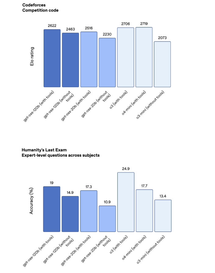 По производительности gpt-oss-120b сопоставима с проприетарными моделями OpenAI o3 и o4-mini. Меньшая модель немного отстаёт, но показывает близкие результаты в задачах по математике и программированию. На экзамене человечества, основанном на знаниях, gpt-oss-120b достигает показателя 19%, в то время как o3 с инструментами — 24,9%.