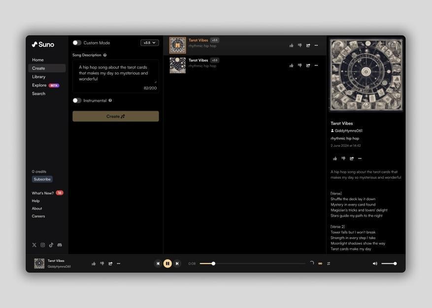 Suno — это инновационная нейросеть, разработанная для создания музыкальных композиций и песен на основе текстовых запросов. Для начала использования сервиса требуется авторизация через учетную запись Google, Microsoft или Discord. При регистрации каждому новому пользователю предоставляется 50 бесплатных кредитов, достаточных для генерации пяти треков. При формировании запроса пользователь может указать язык, жанр и стиль исполнения предпочитаемой композиции, например, французский рэп или лиричную рок-балладу. После ввода текста и выбора стиля Suno AI создает две версии трека с разной музыкальной аранжировкой. Каждой композиции автоматически присваивается обложка. Пользователи могут прослушивать треки, добавлять их в плейлисты, скачивать в аудио- или видеоформате, а также генерировать новые сегменты для увеличения продолжительности композиции.