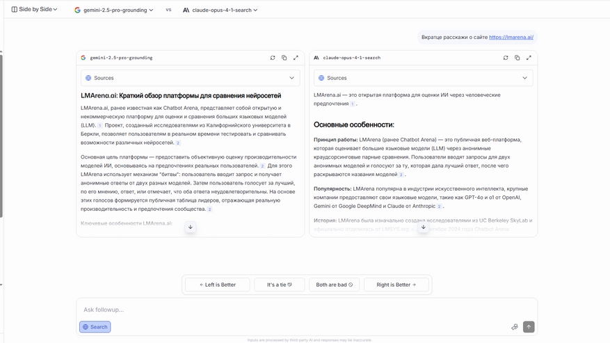 - Side by Side: Здесь вы сами выбираете две конкретные модели и сравниваете их ответы на одни и те же запросы.